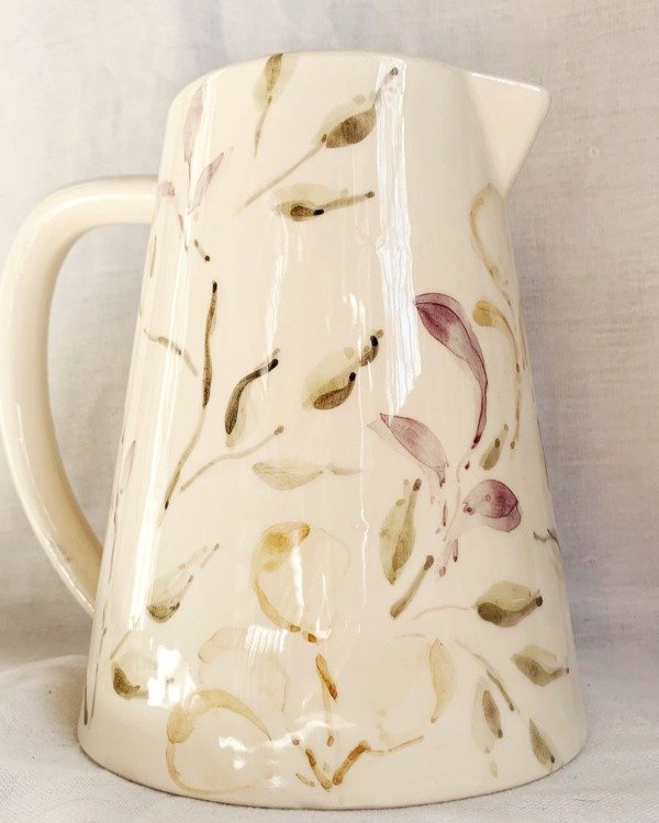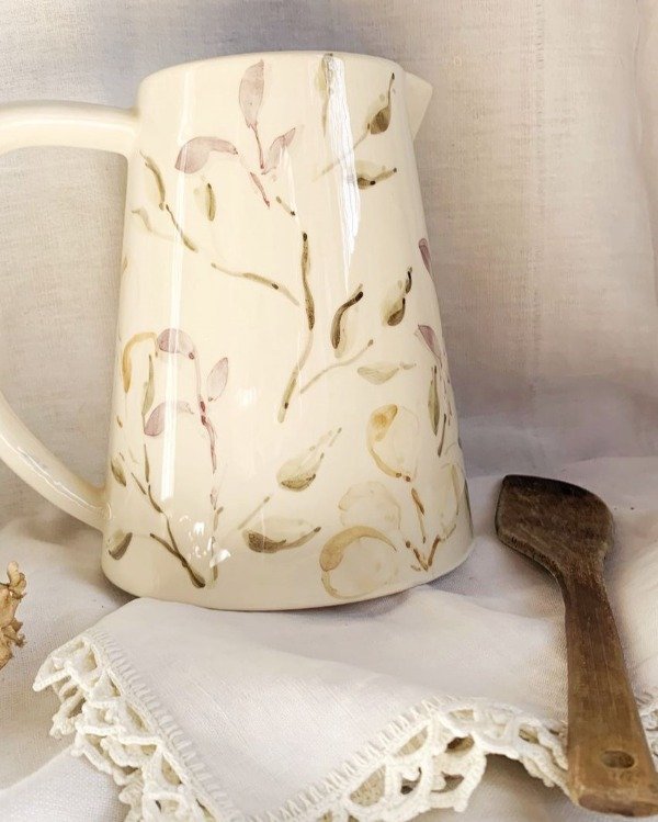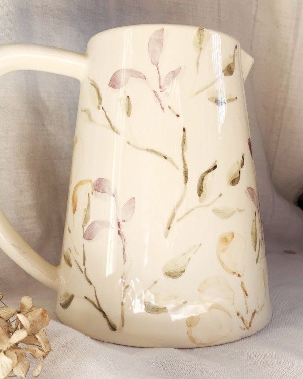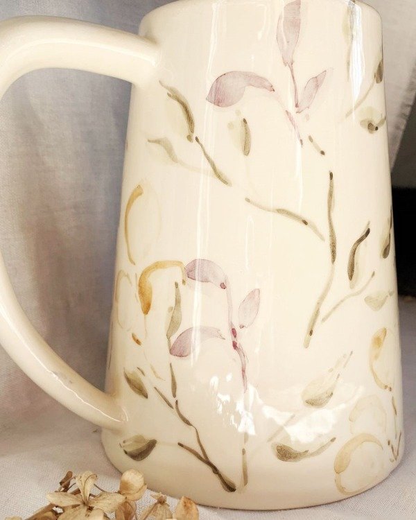 Jarra de cerámica artesanal chica, modelada y pintada a mano con motivos botánicos inspirados en flores silvestres.
