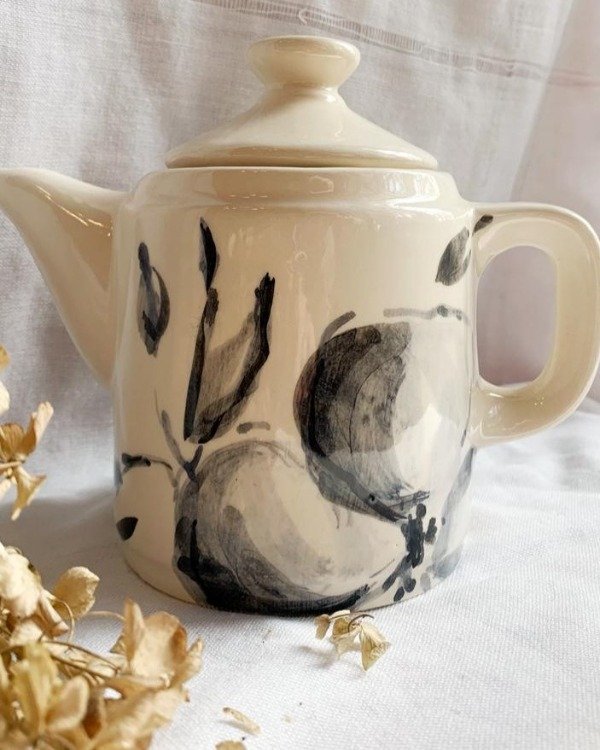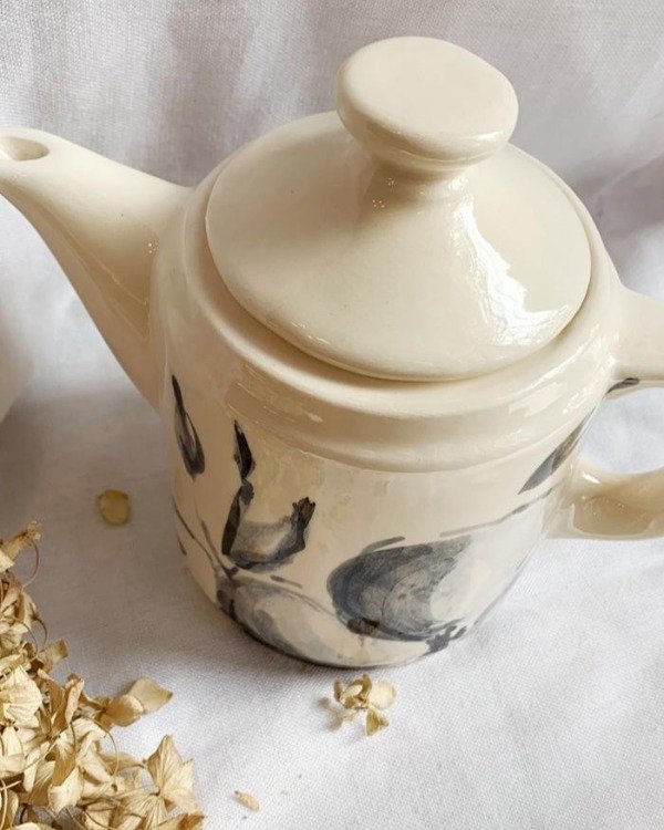 Tetera de cerámica artesanal chica, modelada y pintada a mano con motivos botánicos inspirados en flores silvestres.
